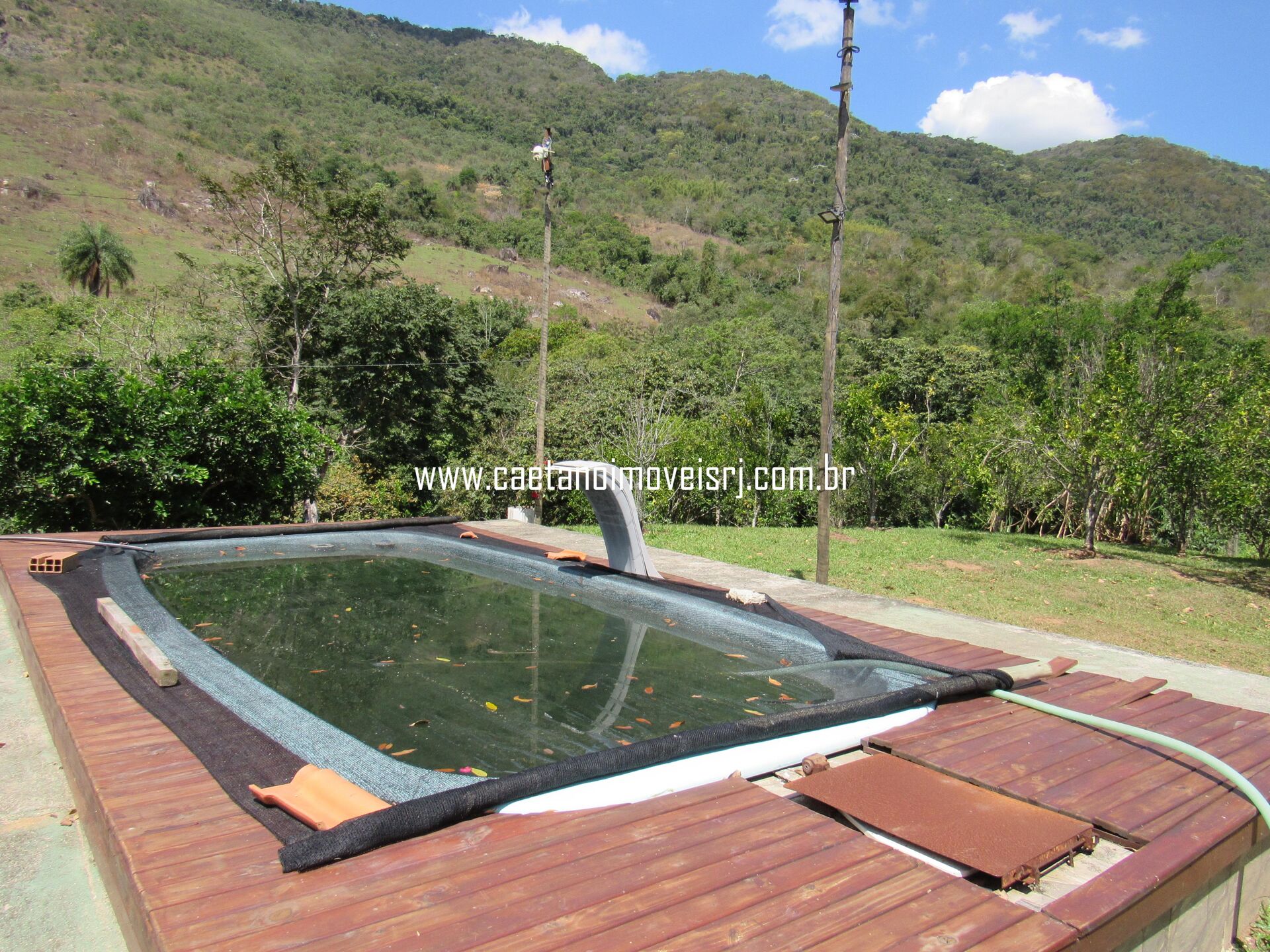 Além disso, possui área com churrasqueira e fogão à lenha, piscina com deck de madeira; é gramado, ajardinado, com excelente vista panorâmica, diversas frutíferas, plantação de aipim, além de excelente localização (região nobre composta de chácaras e sítios).